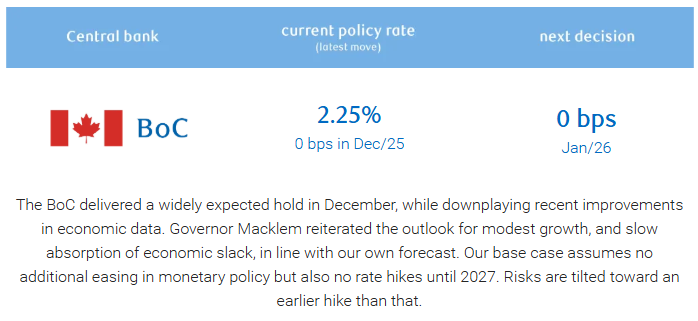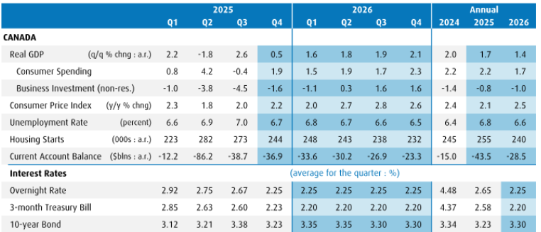 RBC Economics forecasts that the Bank of Canada will remain on hold throughout 2026. Their outlook suggests that after the significant easing seen in 2024 and 2025, the central bank will enter a period of stability to assess the impact of previous cuts. RBC expects the overnight rate to stay steady as the BoC balances persistent services inflation against a low growth economic environment.
